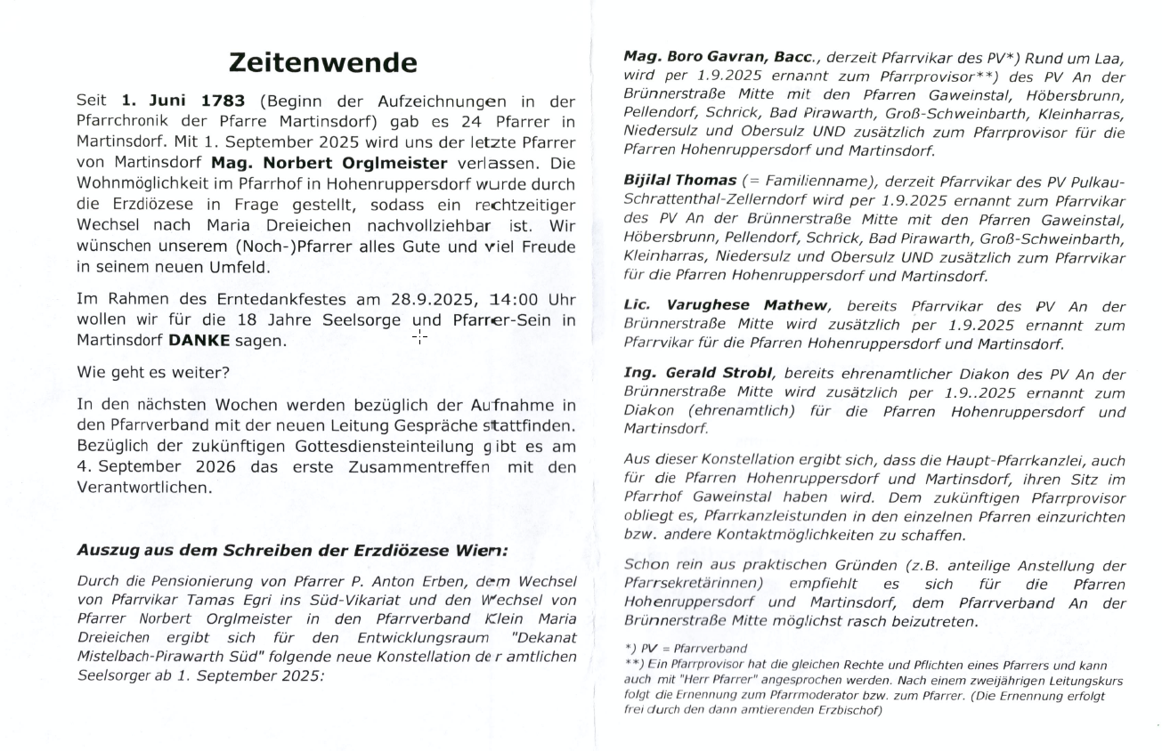 gab es 24 Pfarrer in Martinsdorf. Mit 1. September 2025 wird uns der letzte Pfarrer von Martinsdorf